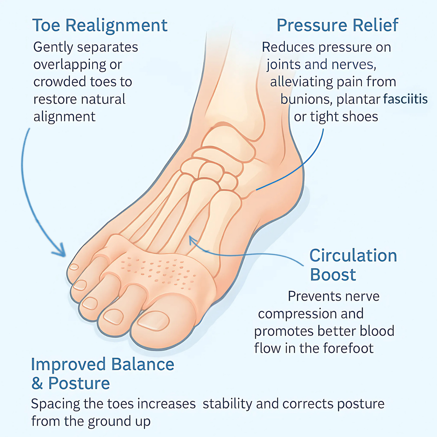 Vane Toe Separators work by gently restoring your toes to their natural alignment, which relieves tension and reduces painful pressure from crowding, bunions, or tight footwear. By creating space between your toes, they send calming safety signals to your brain, helping to break the cycle of pain and discomfort. Made from soft, flexible silicone, they fit comfortably for daily wear, support better posture and balance, and promote healthier foot mechanics, making every step feel easier and more natural.